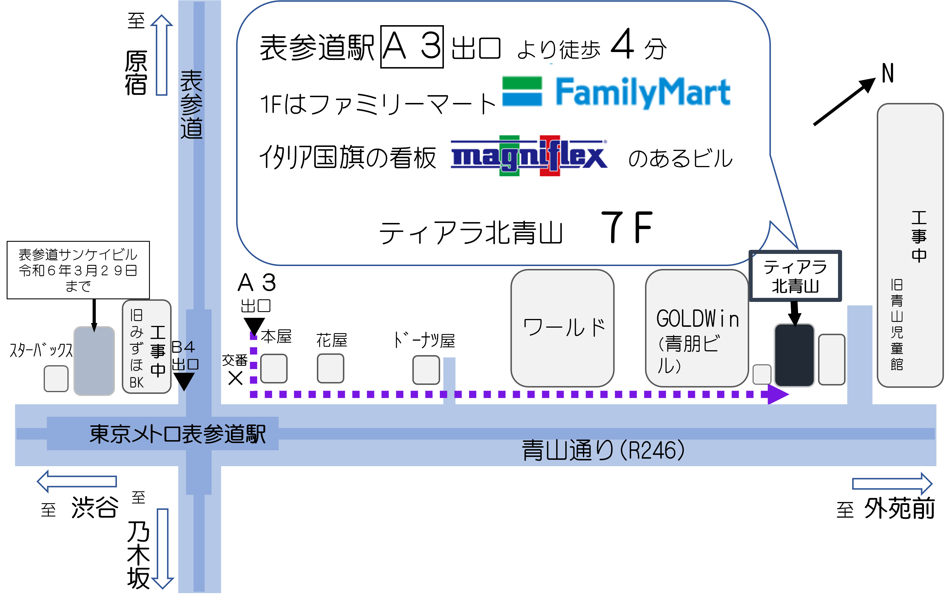 東京メトロ 銀座線・半蔵門線・千代田線 表参道駅A3出口が最寄りです。(エスカレーターをお使いの方はB4出口をご利用の上、外苑前方向へ横断歩道を渡って下さい。)